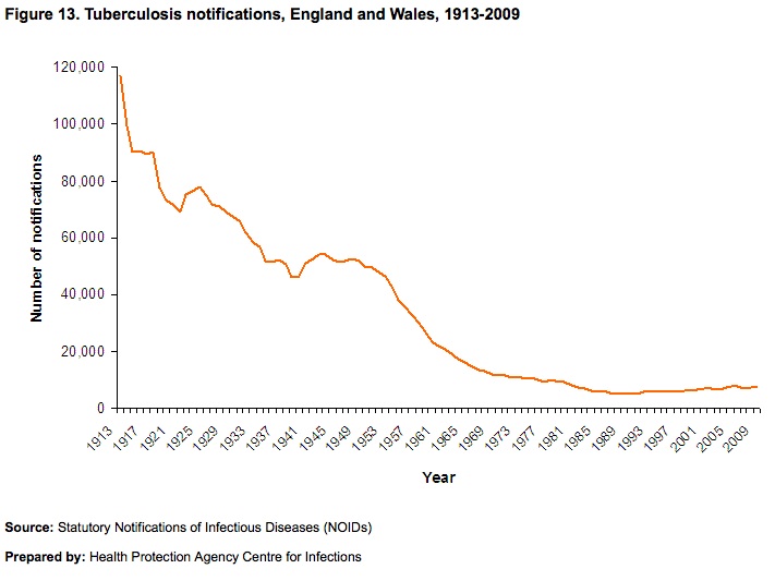 It is pertinent to look at the social conditions that prevail when TB is on the increase. The chart shows increases in UK in 1923-28. This was the time of the national strike; a great divide between rich and poor. Again 1943-49 similar poverty divisions as the war dragged on and the poverty after resulted in rationing. Then there has been a steady increase since 1989 and over this period there has been a widening of the gap between rich and poor. So the factors affecting TB  are poverty on the one hand but unfair distribution on the other. There was much poverty still around in the 1950’s but the gap between rich and poor was narrowing and TB was abating.